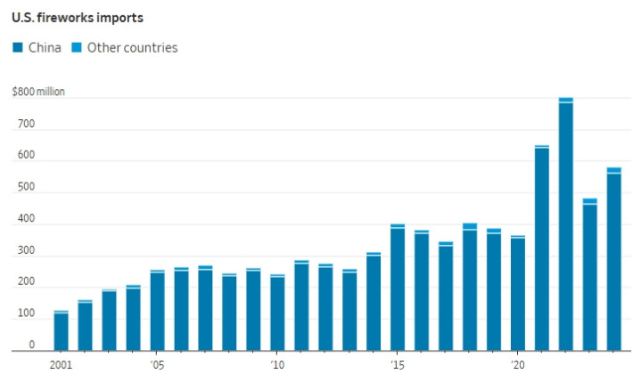 数据显示,美国消费类烟花99%依赖中国进口 《华尔街日报》制图